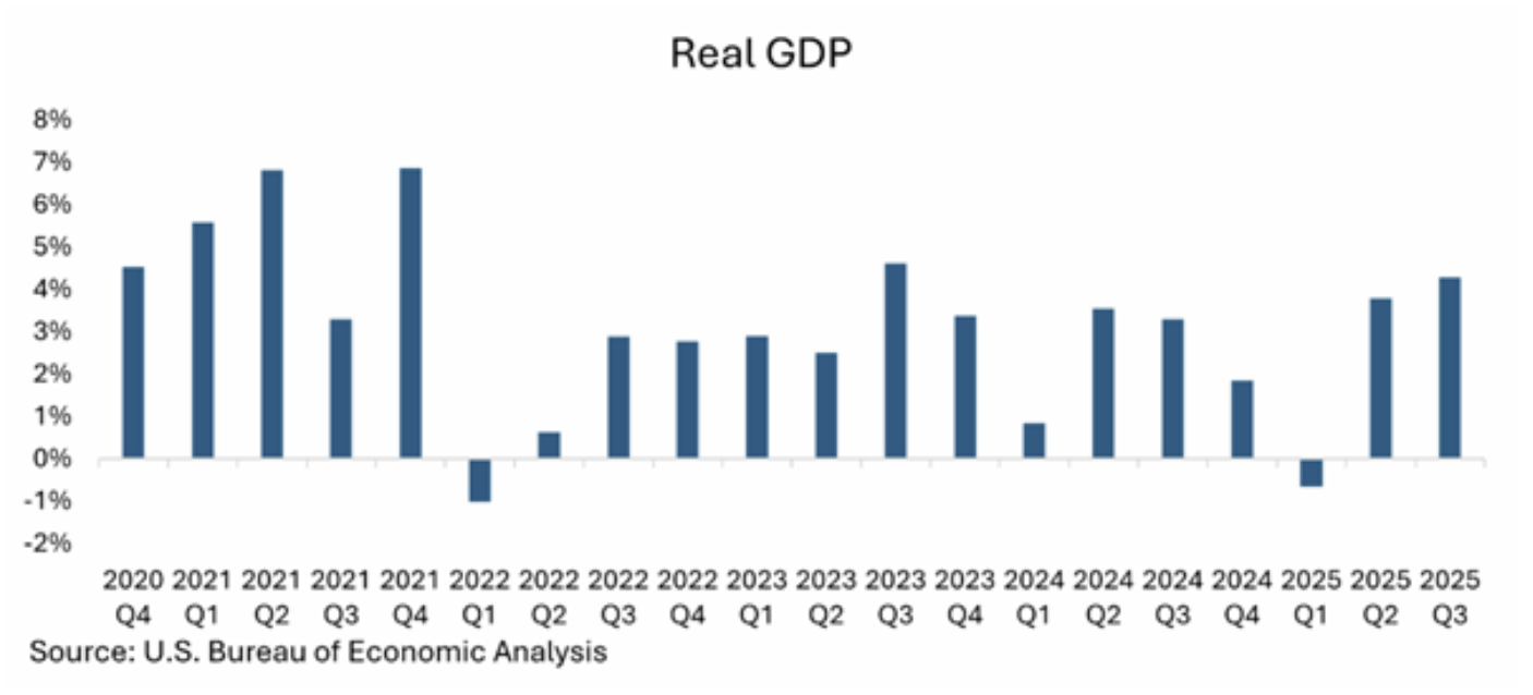 Despite ongoing concerns around the labor market, tariffs, and inflation, economic growth exceeded expectations, highlighting a resilient backdrop supported by strong consumer demand even as job growth shows signs of cooling. Consumer spending rose 3.5% for the quarter, accounting for more than half of total real GDP growth. Additional support came from net exports, as exports increased while imports declined 4.7%, likely reflecting the impact of tariffs.