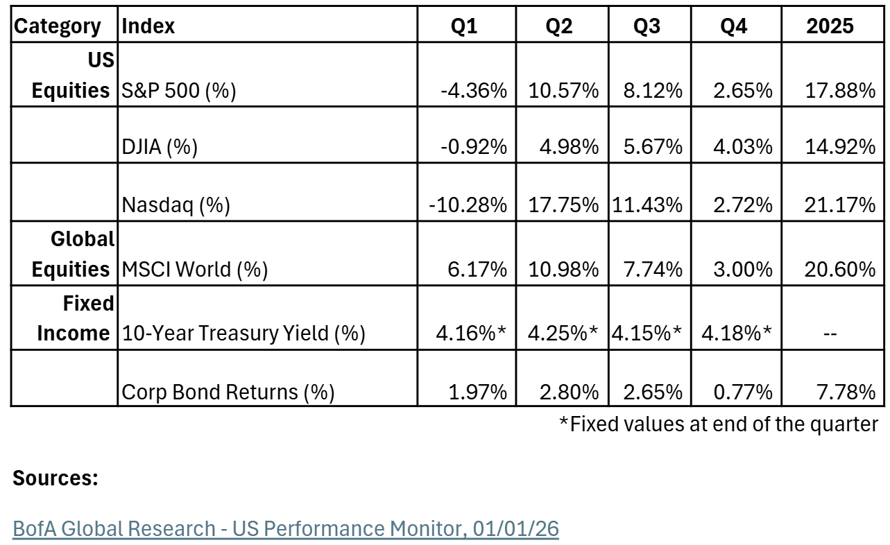 Looking ahead to 2026, we anticipate a transition from broad market growth to a more selective environment. While global research firms expect continued expansion, the pace will likely be more moderate and uneven. As structural forces, such as artificial intelligence and global realignment, take center stage, we believe the “rising tide” of previous years will be replaced by a cycle that rewards discipline and thoughtful portfolio construction.
