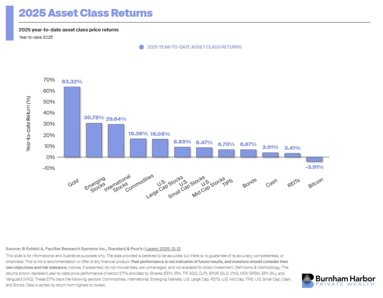 - Gold was the best performing asset class in 2025 (+63.32% as of 12/12/2025).