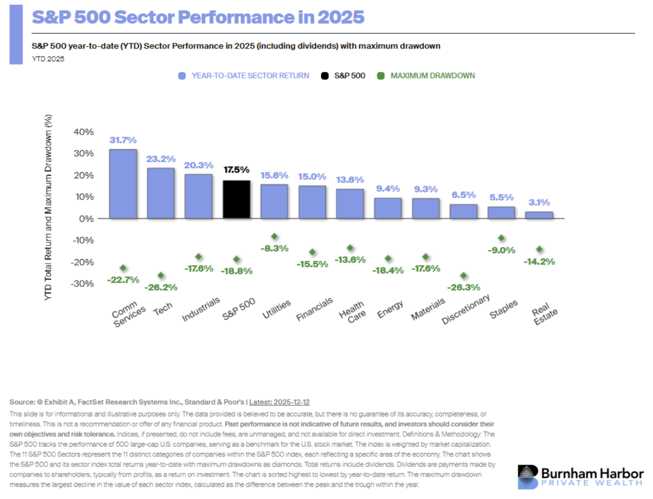 The tech bubble economists, news outlets and analysts have been describing is elevated, in part, by the circular deal making we’ve seen among the largest AI infrastructure, computing and product companies (PBS, 12/29/2025). Increased valuations based on borrowed money from players on the same team have stoked fear that one of the highest performing sectors of the last few years is overvalued and that its expected revenue won’t measure up to expectations. Further, we see heightened consolidation in the S&P 500, with the Mag-7 consisting of tech giants controlling over a third of the index’s market cap. This could increase the chances of any meaningful dip in the market for tech affecting the index more broadly. Other sectors, like utilities and consumer services, can be entangled with AI by the nature of their business and the far-reaching capabilities of this technology. We believe the long-term growth potential and transformative properties of AI will outperform market volatility and corrections we may see in the future. Staying invested and diversifying geographically, sector-based, and asset-based are our solutions to tech developments from the TMT bubble to social media to AI.