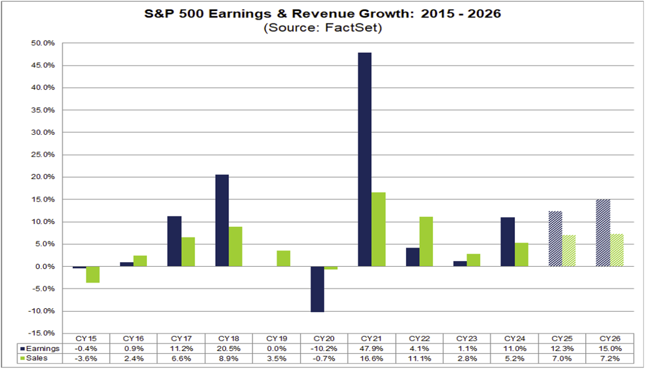 - Looking Ahead: Earnings momentum is expected to accelerate into 2026. Current forecasts call for 11.7% earnings growth in Q1 2026 and 12.7% in Q2 2026, following Q4’s 8.3% gain. For full-year 2025, S&P 500 earnings are expected to rise approximately 10–11%. Valuations remain elevated, with the forward 12-month P/E near 22.5, above long-term averages, leaving markets increasingly dependent on sustained earnings growth to justify current price levels.