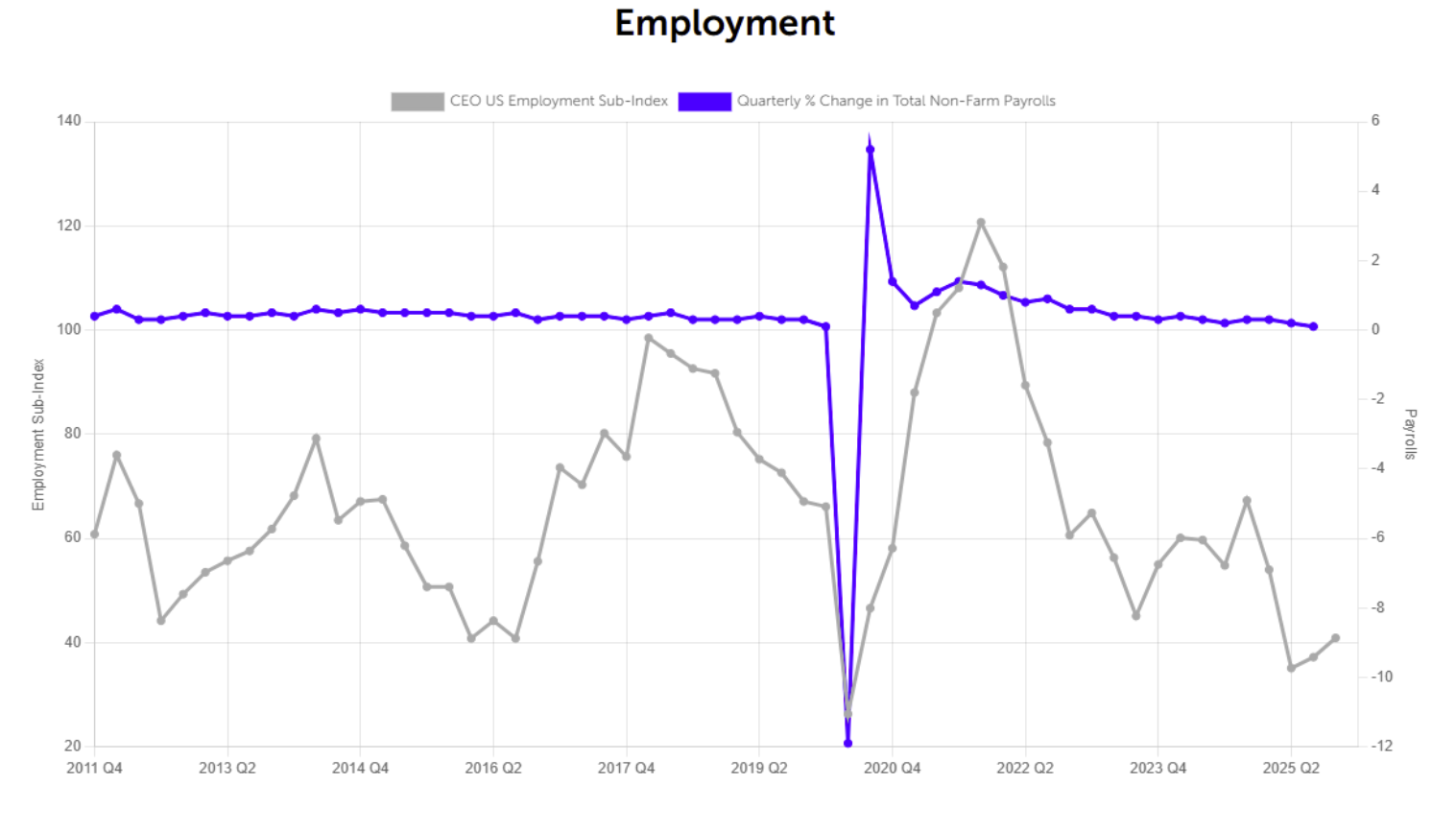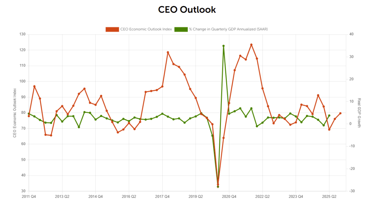 One new piece of data we’ve looked at over the past year is CEO outlook’s correlation with employment. The graph below is pulled from CEOs participating in the Business Roundtable and showcases how little changes in hiring affect the broader labor market. While the employment sub-index is slightly lower than Q3 of 2024, other leading indicators may be more reliable in evaluating the forward momentum of the economy. Similarly, we see exaggerated CEO outlook compared to GDP growth in the second graph.