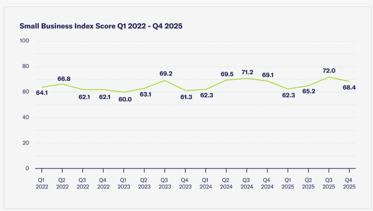 Compared to large public company indices, the small business index is less volatile and more closely reflects regional labor market and GDP conditions. Over the past three years, sentiment has typically been strongest in Q2 and Q3, as shown below.