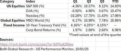 As we enter the final quarter of the year, investors will be focused on three key questions: the pace of Fed rate cuts, how corporate earnings adjust to lower borrowing costs, and whether market leadership broadens beyond large-cap technology. Inflation, consumer spending, and profit margins will remain central drivers of sentiment and portfolio outcomes. While some volatility is likely as markets recalibrate to a new policy environment, we believe the backdrop supports continued opportunities across both equities and fixed income as the cycle unfolds.
