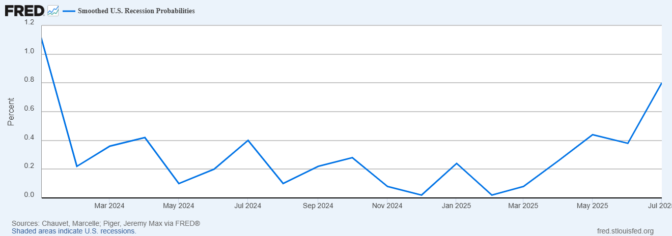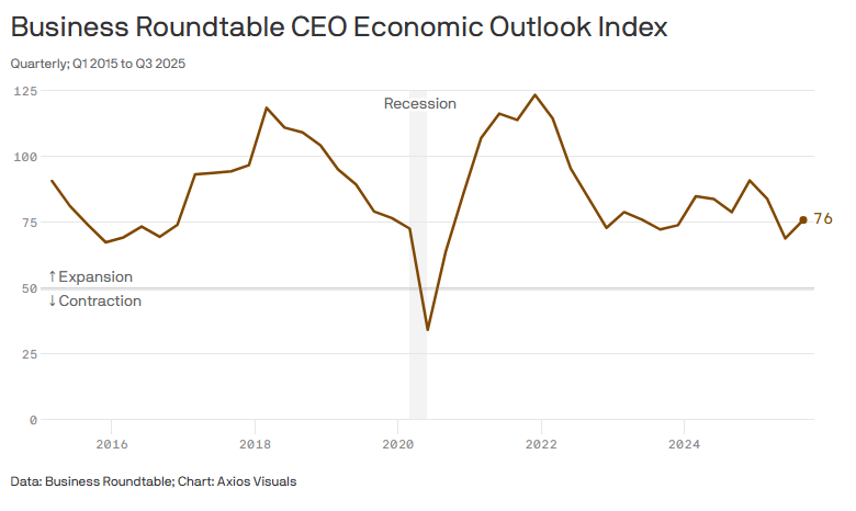 However consumers feel about the market isn’t reflected in the eyes of US corporations. Artificial intelligence and a recovery in capital expenditures provides a stronger basis for growth and stability among companies, with price hikes passed onto consumers, as denoted by the increase in CPI and decrease in PPI in August. CEOs polled by Axios’ Business Roundtable have a 76 score on their Economic Outlook Index, up from a Q2 drop we haven’t seen since the end of the pandemic.