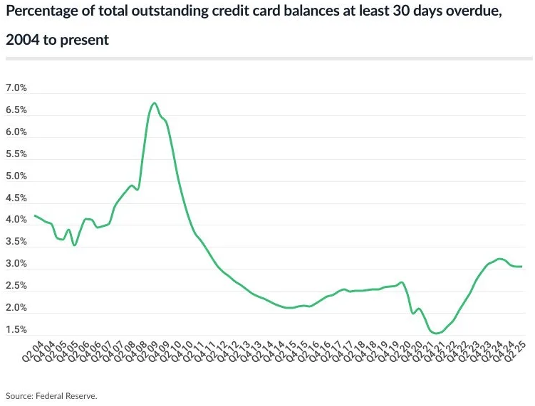 Hard data confirmed the trend. As of mid-2025, 12.27% of credit card accounts were 90+ days past due, well above the 10.93% level recorded a year earlier.