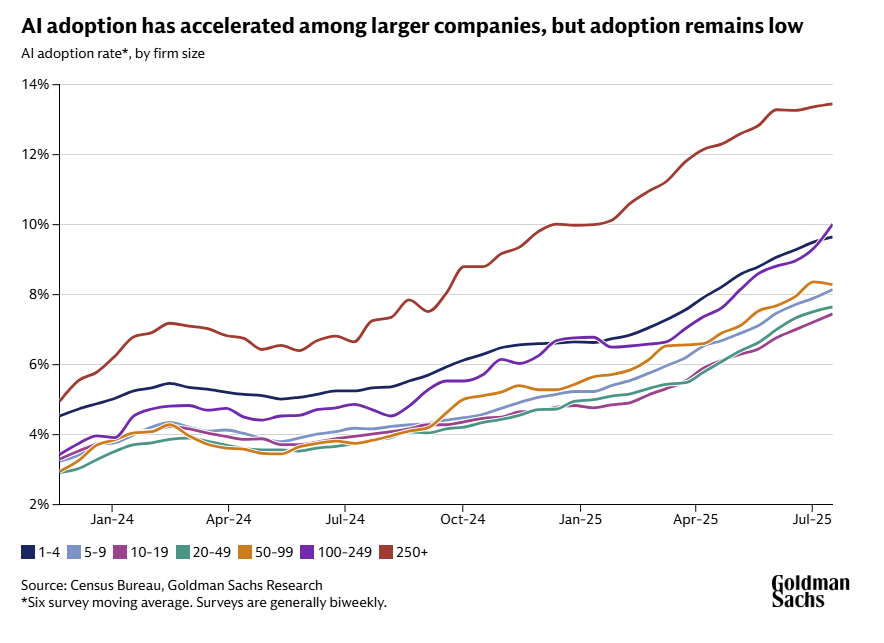 - Larger companies, (those with 250 or more employees) are seeing a much greater adoption of artificial intelligence than its smaller counterparts, with small to mid-sized companies still seeing adoption rates below 10%.