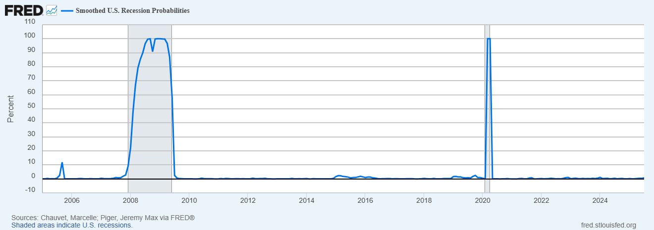 Recession probabilities have picked up since May of this year due to inflation and economic slowdown pressures, with September’s rate cut yet to be factored into the equation. Over the course of 20 years, we’ve seen recession probabilities spike to 5-10% every 2-5 years, indicating a normal pattern of market fear for a major drawdown.