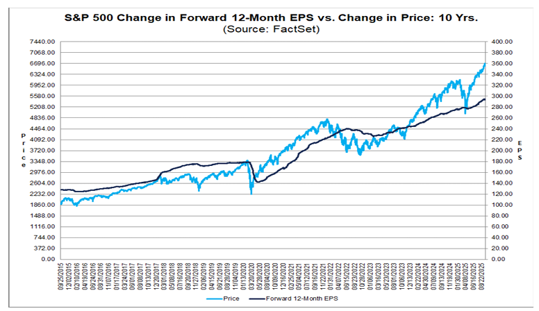 Looking Ahead: Analysts expect earnings momentum to continue into next year. Forecasts call for 7.3% growth in Q4 2025, followed by 11.7% in Q1 2026 and 12.7% in Q2 2026. For the full year, S&P 500 earnings rise 10.8%, keeping valuations stretched: the forward 12-month P/E stands at 22.5, above both 5- and 10-year averages. Markets weigh this premium against the prospect of sustained double-digit earnings growth.