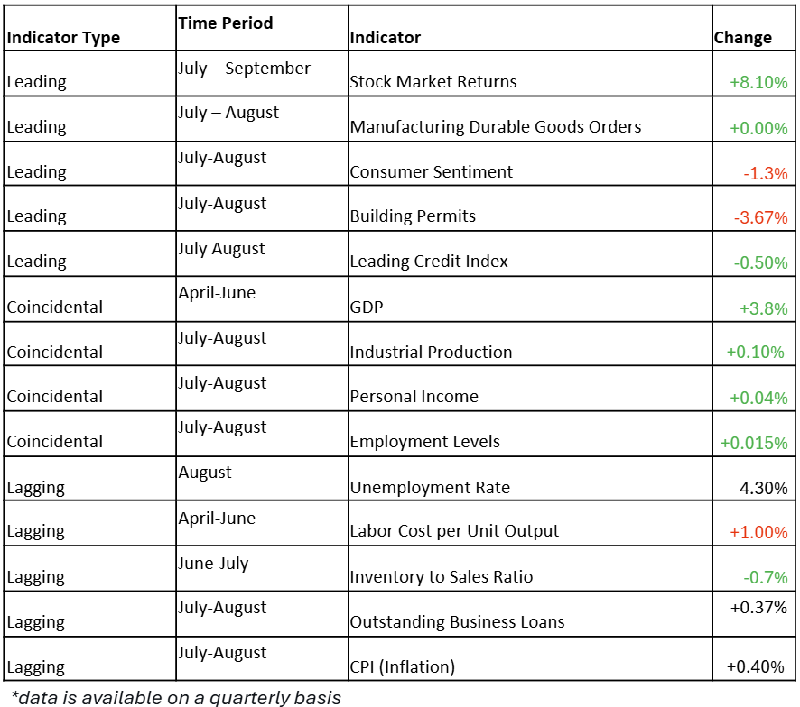 The leading economic index is typically our telltale signal of economic strength for the months and years ahead. As seen below, our leading indicators are mostly positive, with consumer sentiment and building permits falling at the end of summer.